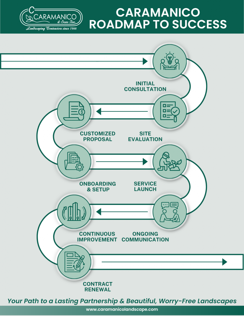 At C. Caramanico & Sons, Inc., we know that exceptional commercial landscaping doesn’t happen by accident—it’s the result of a proven, step-by-step process designed to deliver long-term beauty, safety, and value for your property. We call it the Caramanico Road to Success. Every step is carefully designed to ensure your landscape not only looks impressive but also thrives throughout the year.